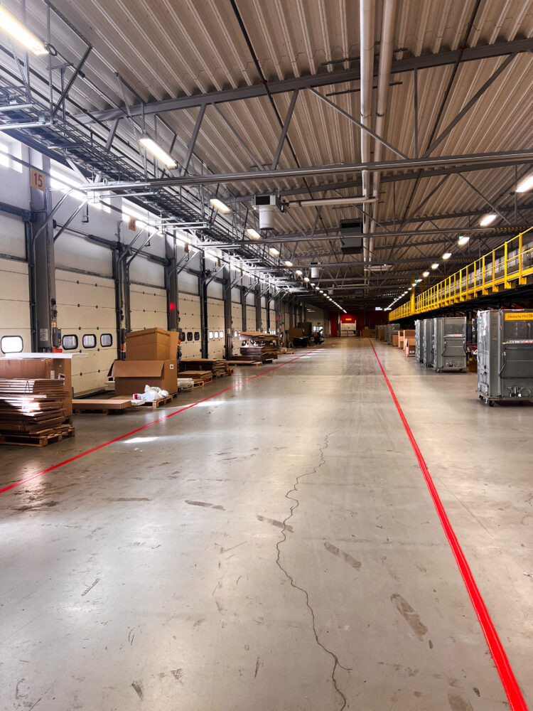 Linjamaalaus on kestävä ja paljon pitkäikäisempi vaihtoehto lattiamerkintäteipille. Kun maali on kovettunut, reunoja ei tarvitse rullata eikä huoltotöitä tehdä, ja ehkä juuri siksi saamme yhä useammin pyyntöjä linjamaalauksesta – yhä useammassa DHL:n toimipisteessä ympäri Ruotsia.