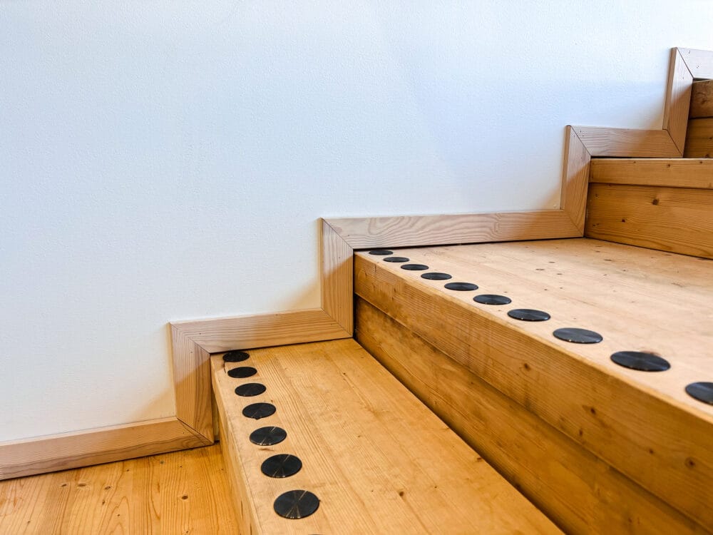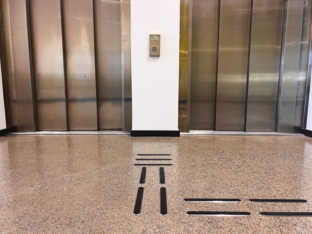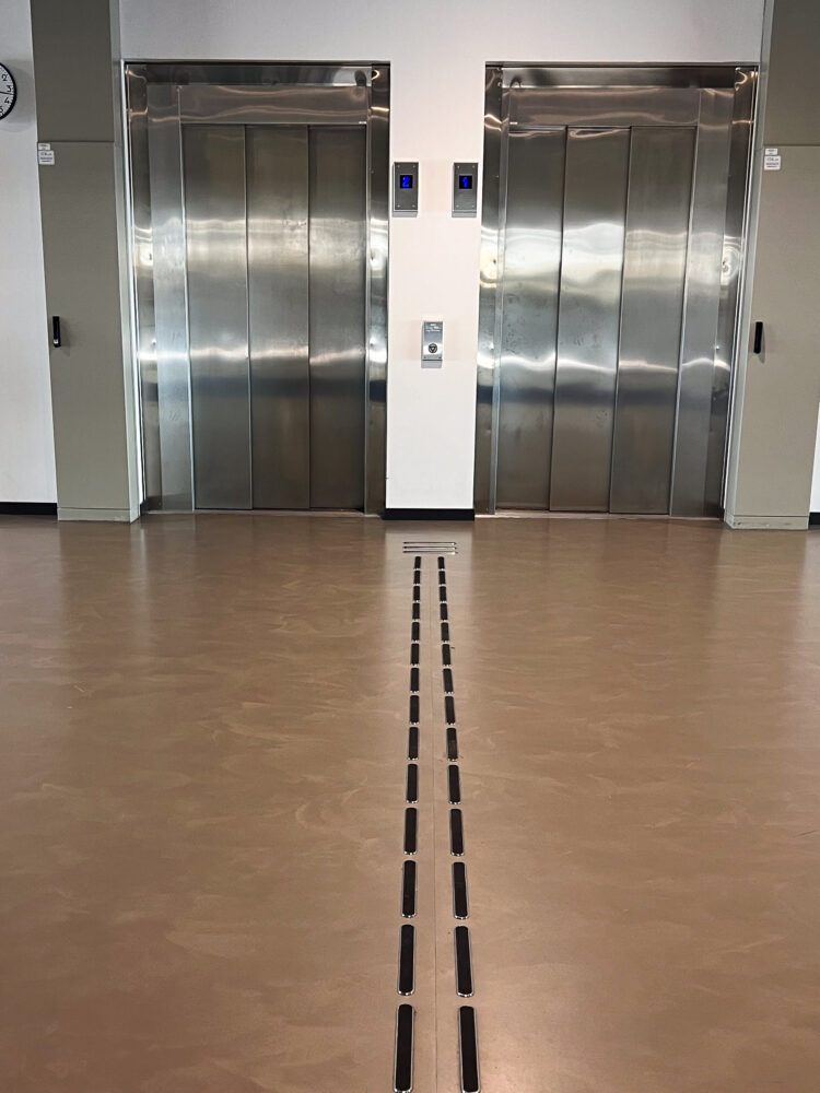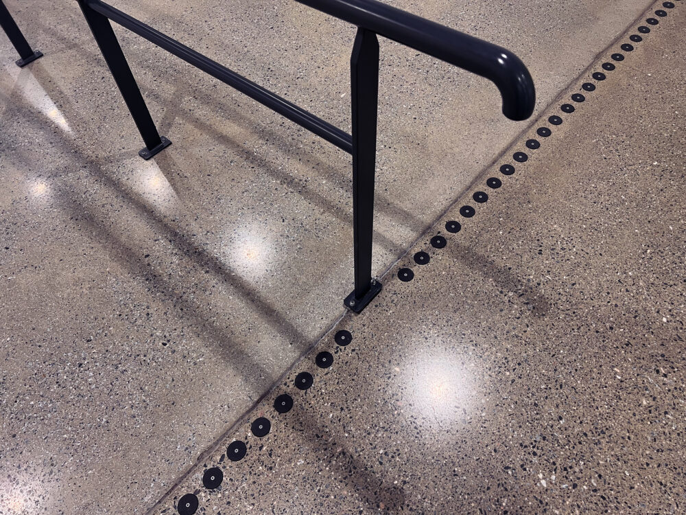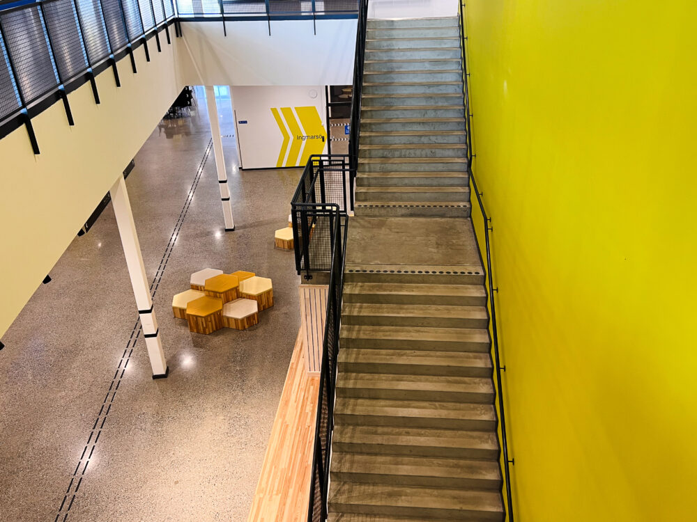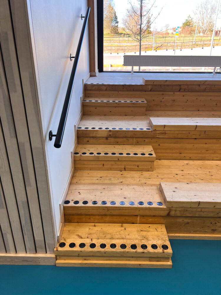 Monitoimiareena on jotain poikkeuksellista – sekä valmiina rakennuksena että rakennushankkeena. Se on myös yksi suurimmista hankkeista, joissa olemme olleet mukana. Kuten nopea rakennusaika kertoo, meille oli myös tärkeää toimia tehokkaasti, joten kun In3prenör otti meihin yhteyttä joulukuun 2021 alussa, sovimme nopeasti: Kontrastimerkinnät ruostumattomasta teräksestä, jossa on musta PVD-pinnoite, joka antaa riittävän kontrastin alustaan nähden ja samalla saa kauniin ja kestävän pinnan. Jotta merkinnät kestäisivät mahdollisimman suuria kuormituksia, valitsimme merkinnät nastoilla, jotka porataan lattiaan ja kiinnitetään asennusliimalla. Lisäksi päätimme sovittaa kontrastimerkinnät yhteen ruostumattomasta teräksestä valmistettujen ohjaussauvojen kanssa, joissa on mustat insertit.