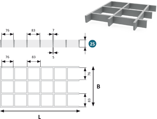 GRP Ritilälattia 25, jonka silmäkoko on 83×83 mm (sisäpinta 76×76 mm), on lasikuituvahvisteisesta muovista (GRP) valmistettu raskaaseen käyttöön tarkoitettu ritilä, joka on suunniteltu tarjoamaan suuren vedenpoistokyvyn ja hyvän mekaanisen vakauden matalassa profiilissa. Se soveltuu 25 mm:n korkeutensa ansiosta erityisen hyvin rakenteisiin, joissa hyvällä vedenpoistolla ja pienellä painolla on suuri merkitys.