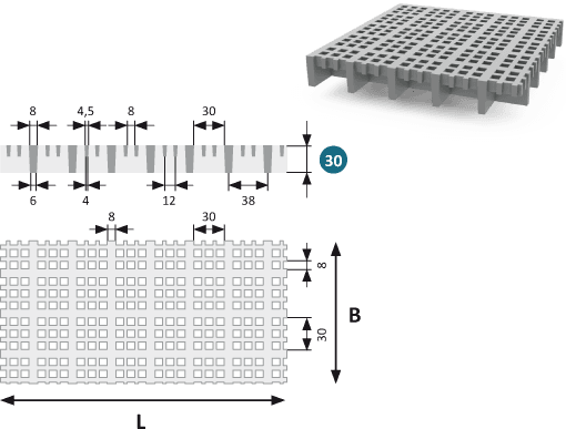 GRP Ritilälattia 30 Micro, jossa on 8×8 mm:n silmäkoko (30×30 mm 4 silmäkoolla) ja 30 mm:n profiilikorkeus, on tiheä ja erittäin kestävä lasikuituvahvisteisesta muovista (GRP) valmistettu ritilä. Hieno verkkorakenne estää hyvin pientenkin esineiden putoamisen läpi.