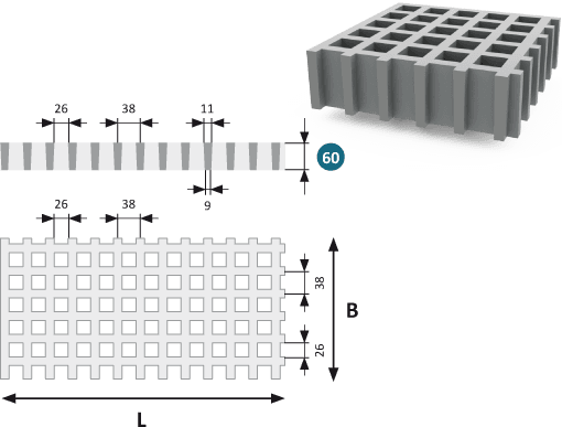 GRP Ritilälattia 60 Heavy Duty on vahvin ritilämme, joka on suunniteltu kestämään erittäin suuria kuormituksia ja vaativia olosuhteita. 60 mm:n profiilikorkeus ja 38×38 mm:n silmäkoko (26×26 mm sisäpuolella) takaavat maksimaalisen kantavuuden ja vakauden – tietenkin yhdistettynä kaikkiin GRP-materiaalin etuihin: alhainen paino, korroosionkestävyys ja pitkä käyttöikä ilman huoltoa.