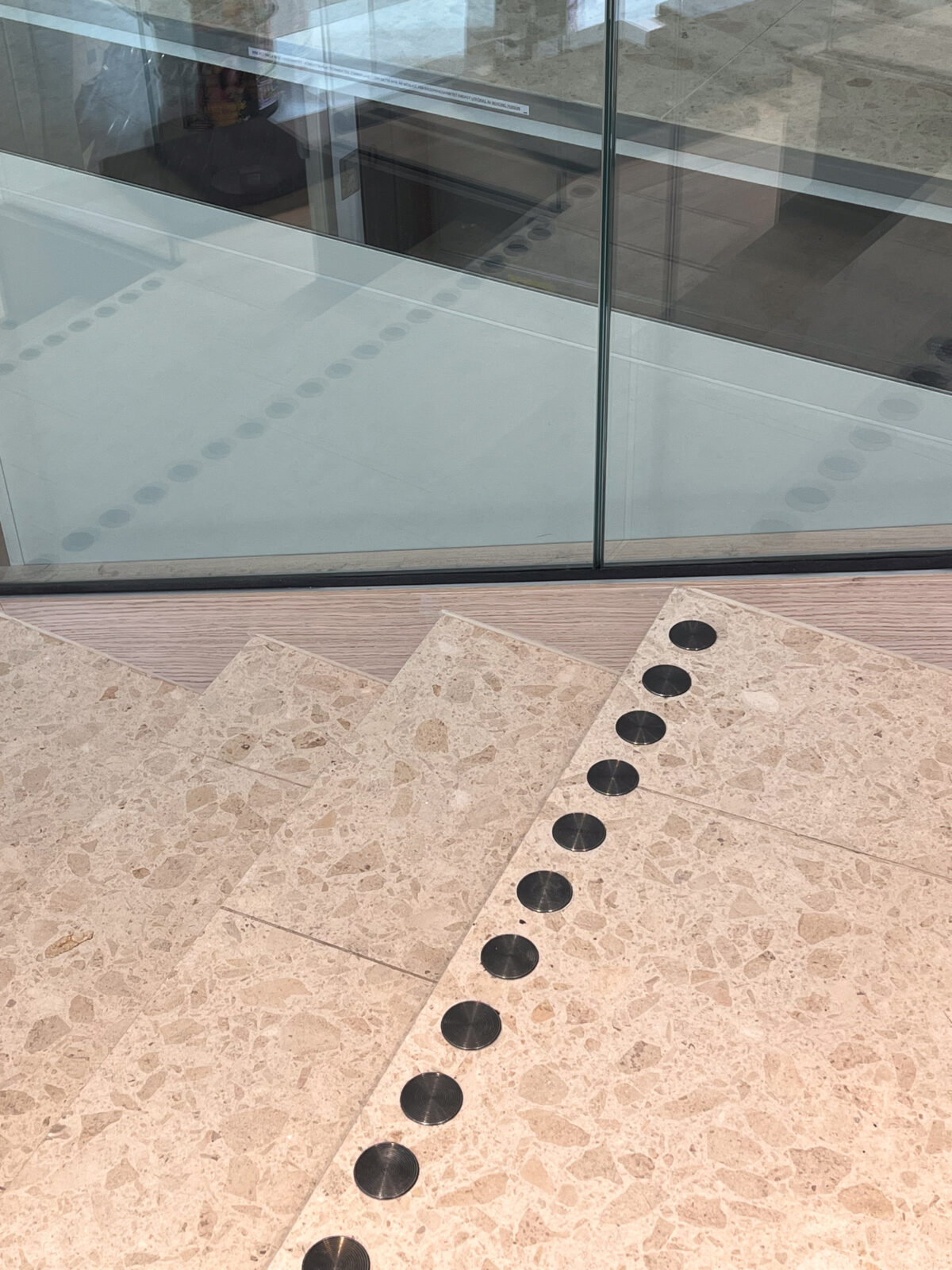 Kontrastimerkinnät ovat tärkeä osa julkisten rakennusten ja tilojen esteettömyyttä. Pisteitä asennetaan yleensä portaisiin, ensimmäiselle ja viimeiselle askelmalle, ovipieliin ja luiskiin sekä merkitsemään lattian tasoeroja.