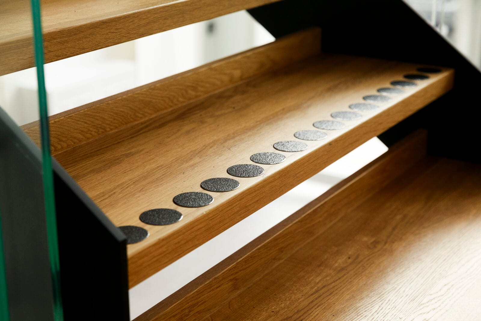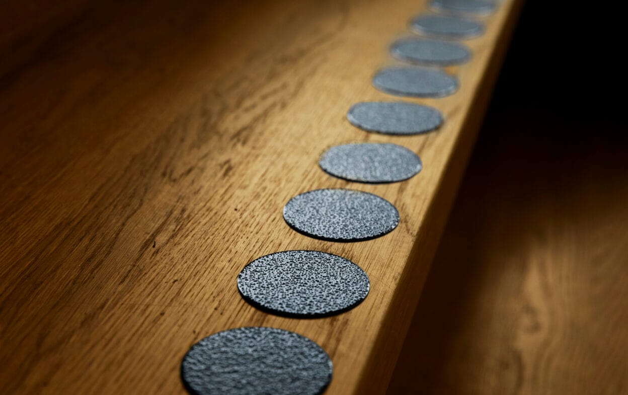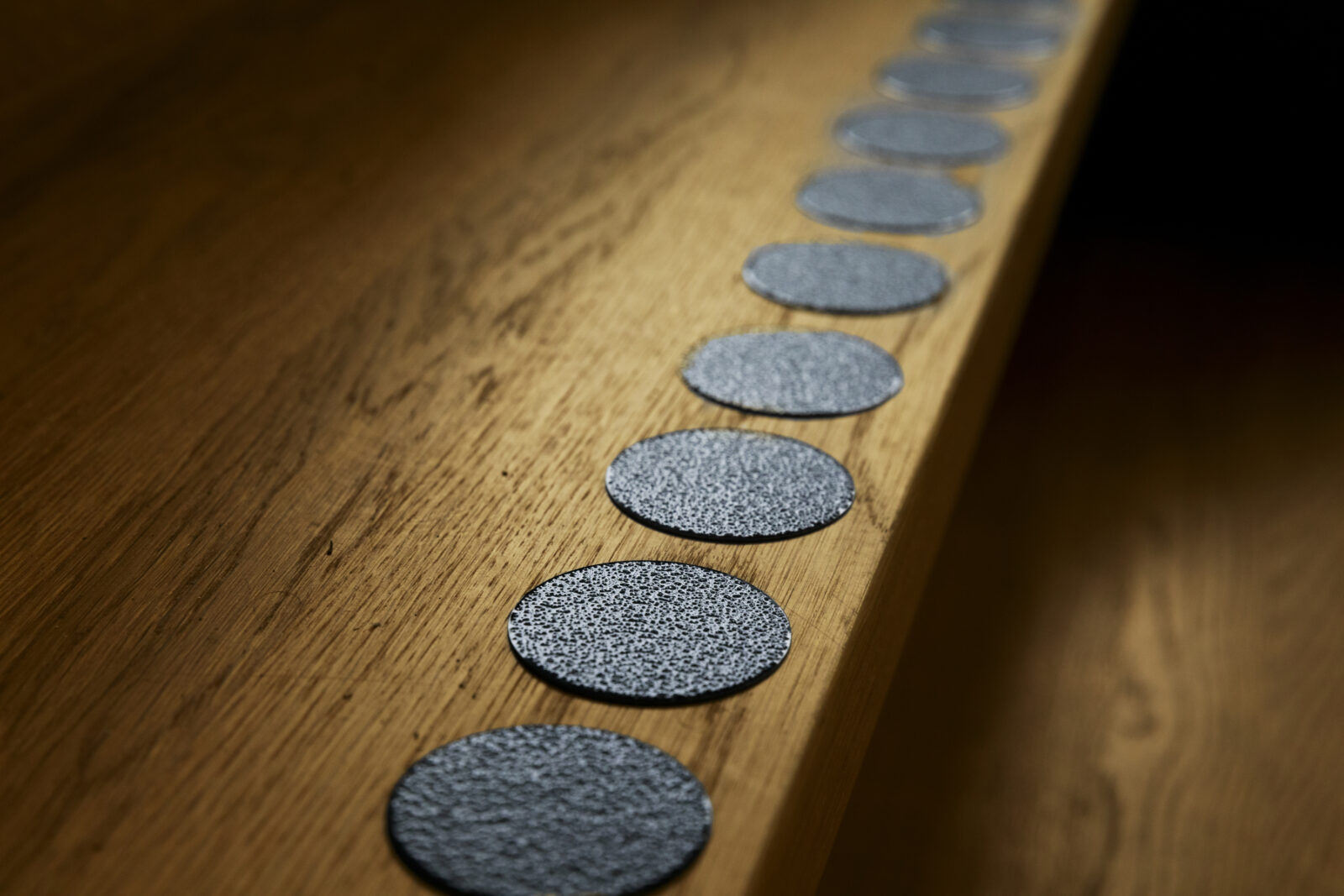 Safestep ERIKSBERG ovat kestäviä kontrastimerkintöjä, joissa on hieno liukastumista estävä lasihelmipinnoite ja alumiinista ja 3M-teipistä valmistettu tausta. Merkinnöillä on erittäin hyvä tarttuvuus ja ne tarttuvat lähes kaikkiin puhtaisiin ja kuiviin sisäpintoihin – kiveen, betoniin, linoleumiin jne. Merkinnät ovat ø50 mm, ne toimitetaan 50 kappaleen pakkauksissa ja niitä on saatavana mustina, valkoisina ja luminoivina. Itseliimautuva tausta on suojattu suojamuovilla, jossa on kätevä läppä asennuksen helpottamiseksi.
