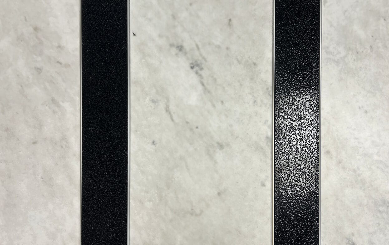 Safestep ERIKSBERG joustavin tuotevalikoimamme taktiilisten opasteiden ja kontrastimerkintöjen osalta. ERIKSBERG on 57 mm leveä alumiiniliuska, jossa on värillinen insertti ja 3M-teippi. Sisäkappaleessa on hieno lasihelmistä valmistettu liukastumista estävä pinnoite, ja sitä on saatavana valkoisena ja mustana, mikä luo hyvän kontrastin useimpien sisäpintojen kanssa. Kuvioitu pinta lisää liukastumisen estoa, ja kiiltävä pinta on helppo pitää puhtaana.