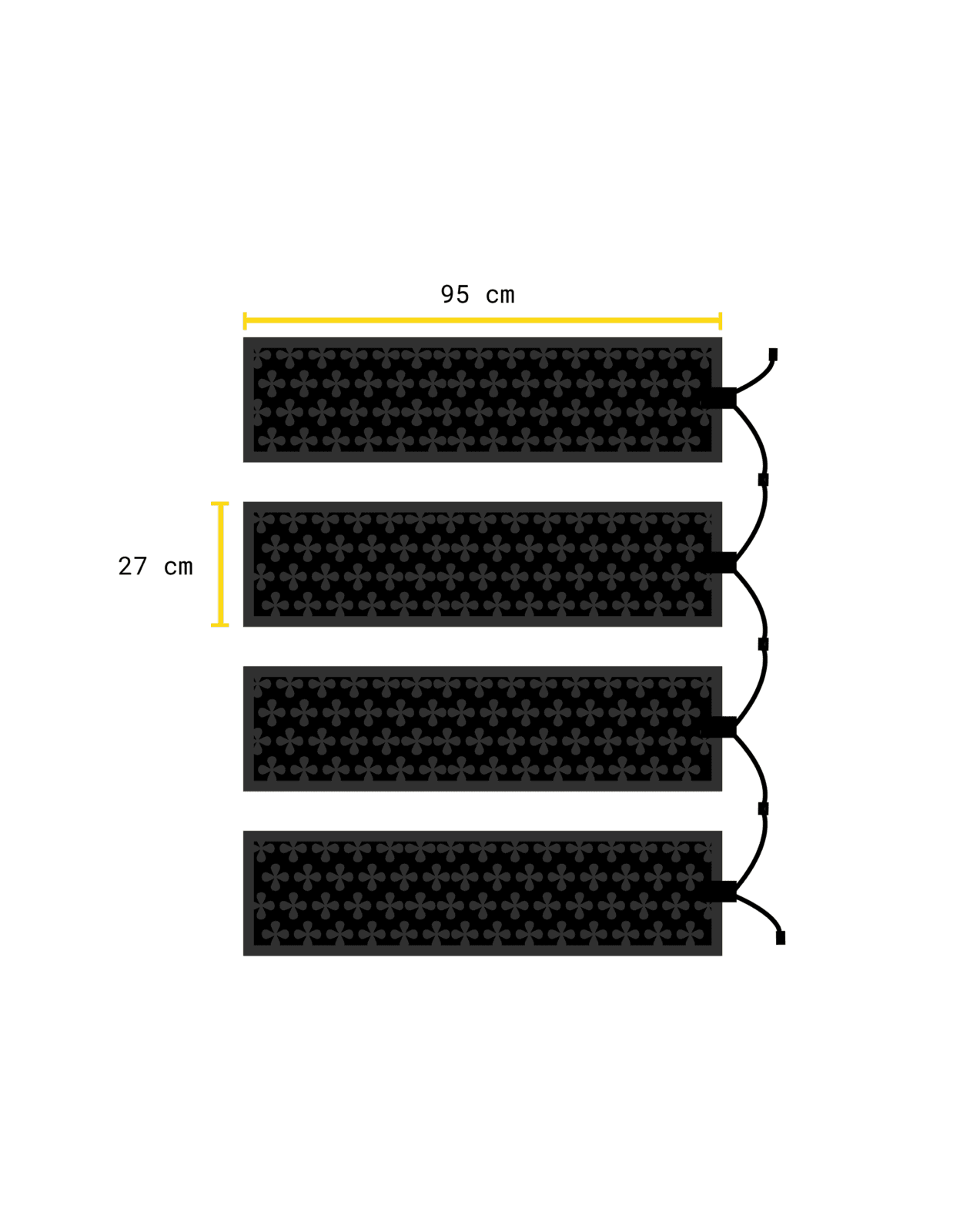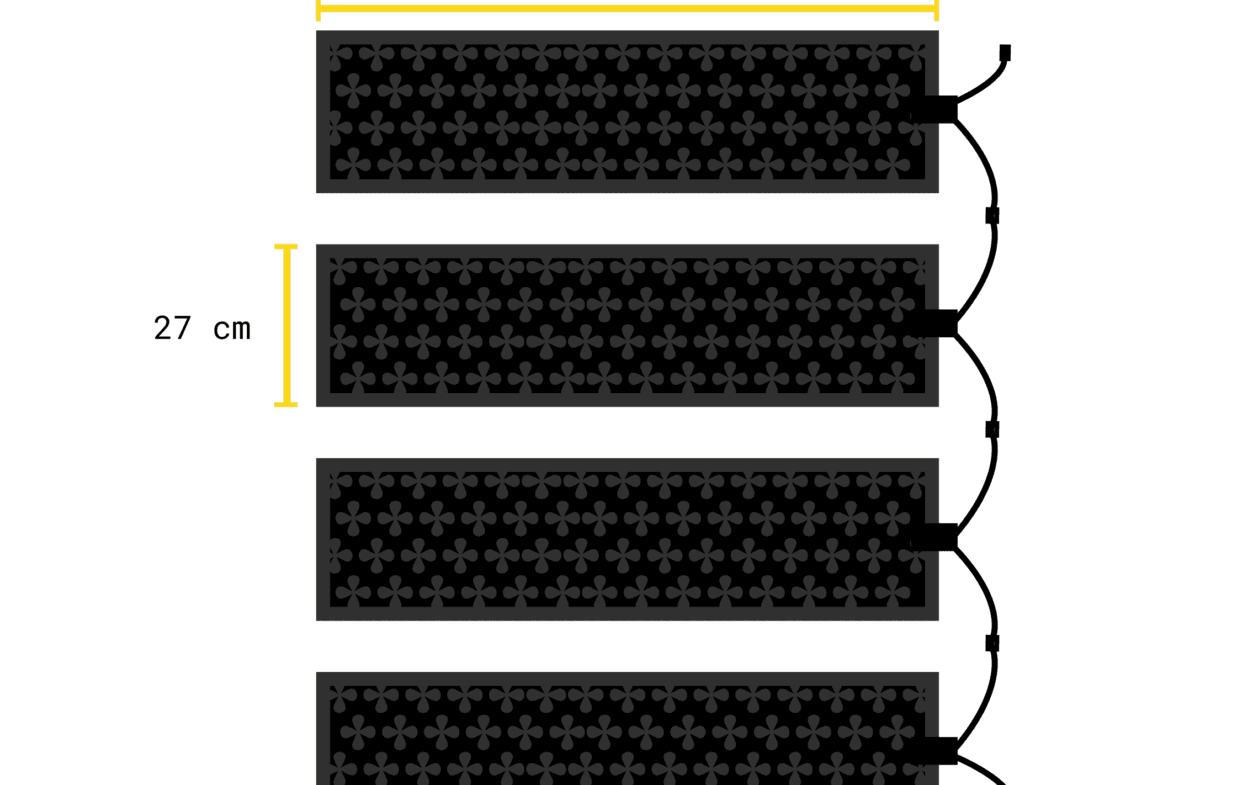 27 x 95 cm: Pienempi lämmitysmatto, joka on suunniteltu sijoitettavaksi portaisiin, ilmalämpöpumpun alle ja muihin vähemmän jäälle alttiisiin tiloihin.