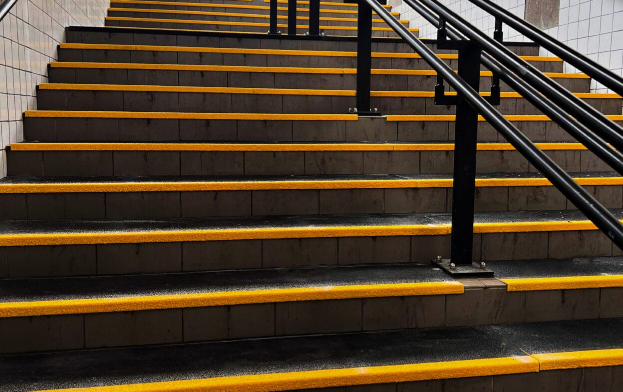 Lasikuituiset porrasaskelmat, joissa on liukumaton alumiinioksidipinta ja keltaiset kontrastireunat, jotka lisäävät selkeyttä ja kontrastimerkintää. Nopea, yksinkertainen ja tehokas ratkaisu, joka antaa hyvän jalansijan, vähentää liukastumisonnettomuuksien riskiä ja auttaa näkövammaisia. Porrasaskelmat suojaavat portaita myös ulkoisilta rasituksilta.